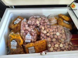 Durante a inspeção, foram apreendidos aproximadamente 360 kg de proteína animal sem a devida conformidade legal para depósito e comercialização — sendo 300 kg de carne bovina e 57,8 kg de carne de jacaré, espécie nativa brasileira protegida por lei.